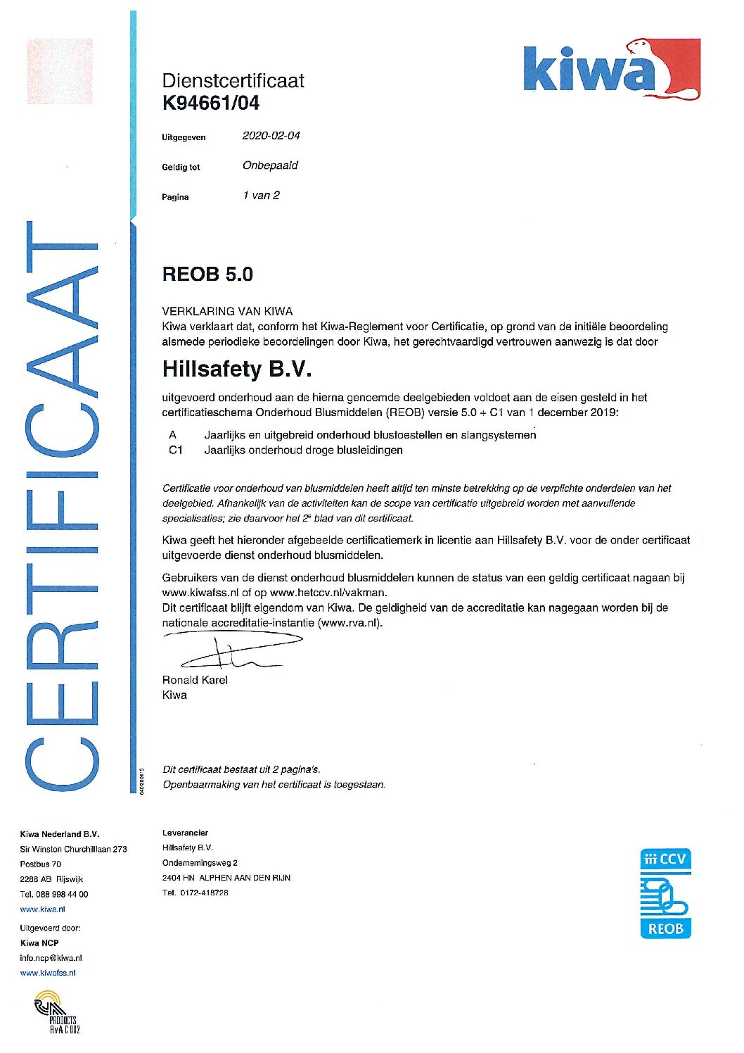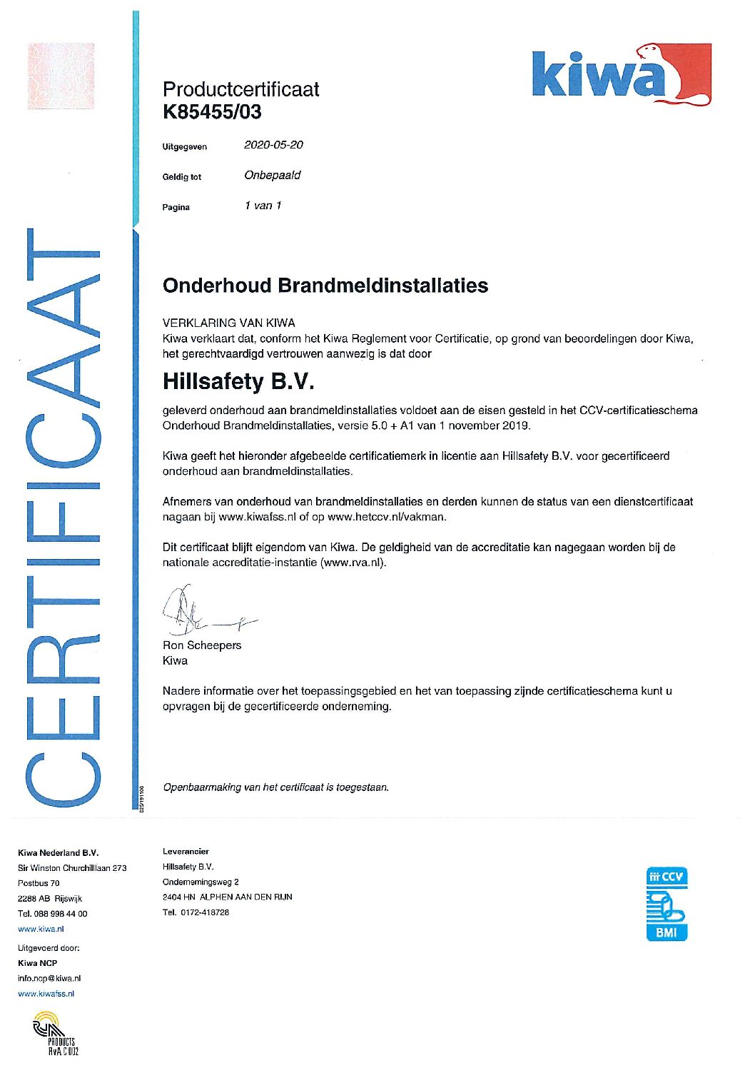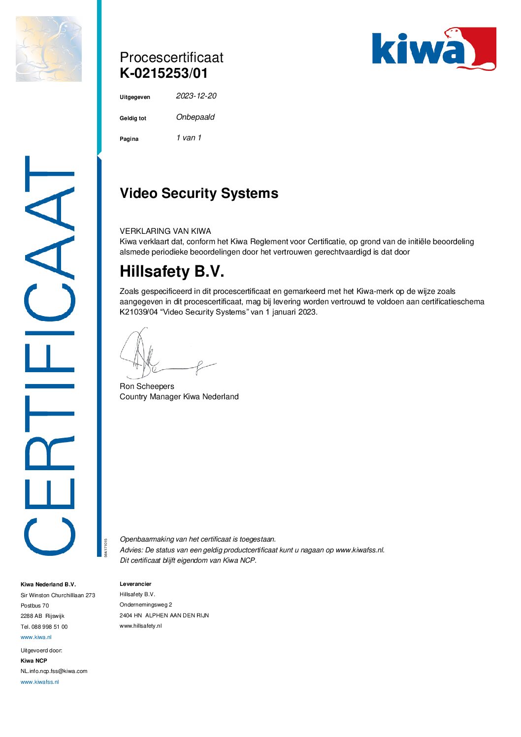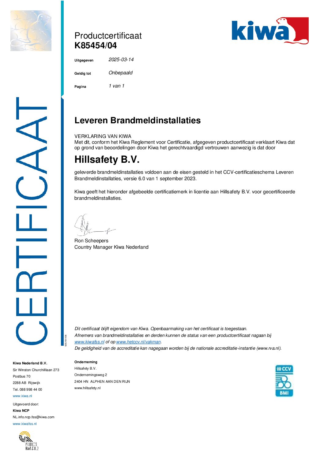 Hillsafety B.V. is gecertificeerd door Kiwa FSS Certification en voldoet aan alle eisen voor de volgende keurmerken:
